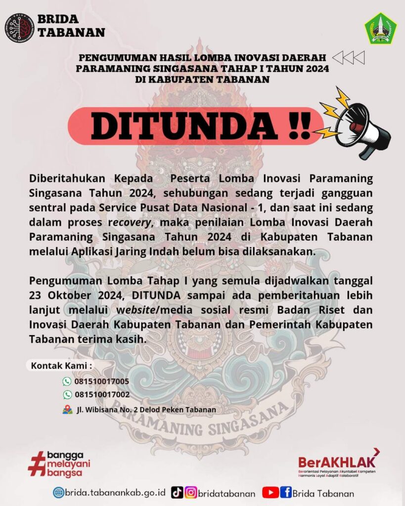 Diberitahukan Kepada Peserta Lomba Inovasi Paramaning Singasana Tahun 2024, sehubungan sedang terjadi gangguan sentral pada Service Pusat Data Nasional – 1, dan saat ini sedang dalam proses recovery, maka penilaian Lomba Inovasi Daerah Paramaning Singasana Tahun 2024 di Kabupaten Tabanan melalui Aplikasi Jaring Indah belum bisa dilaksanakan.